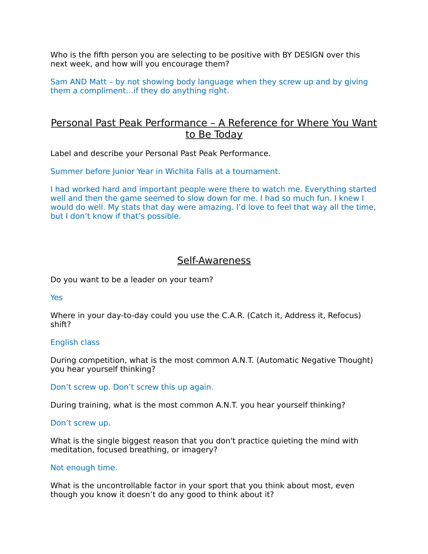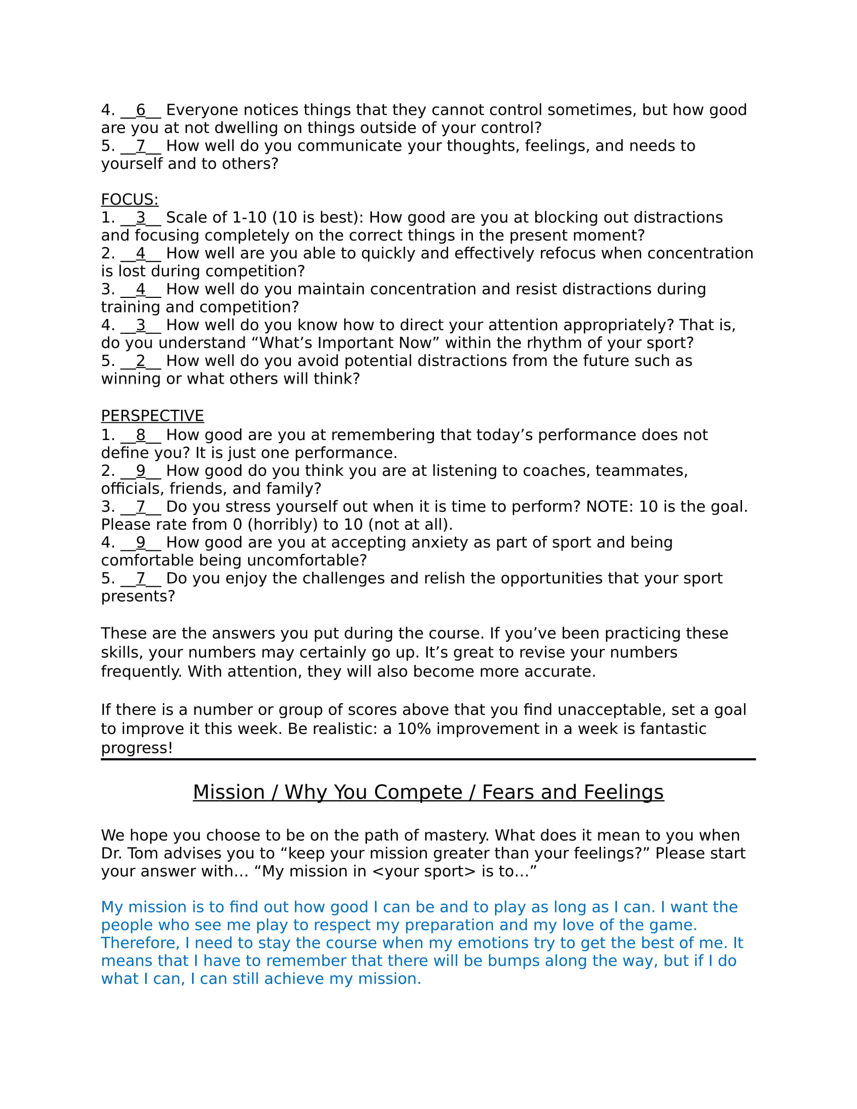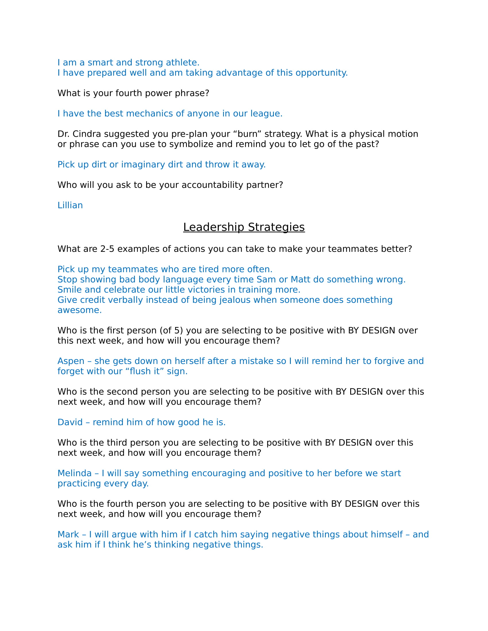 A sample of this output file is provided here. The answers are hypothetical…and represent a leader’s perspective. Some coaches may want to share this sample with their athletes before they start the course.