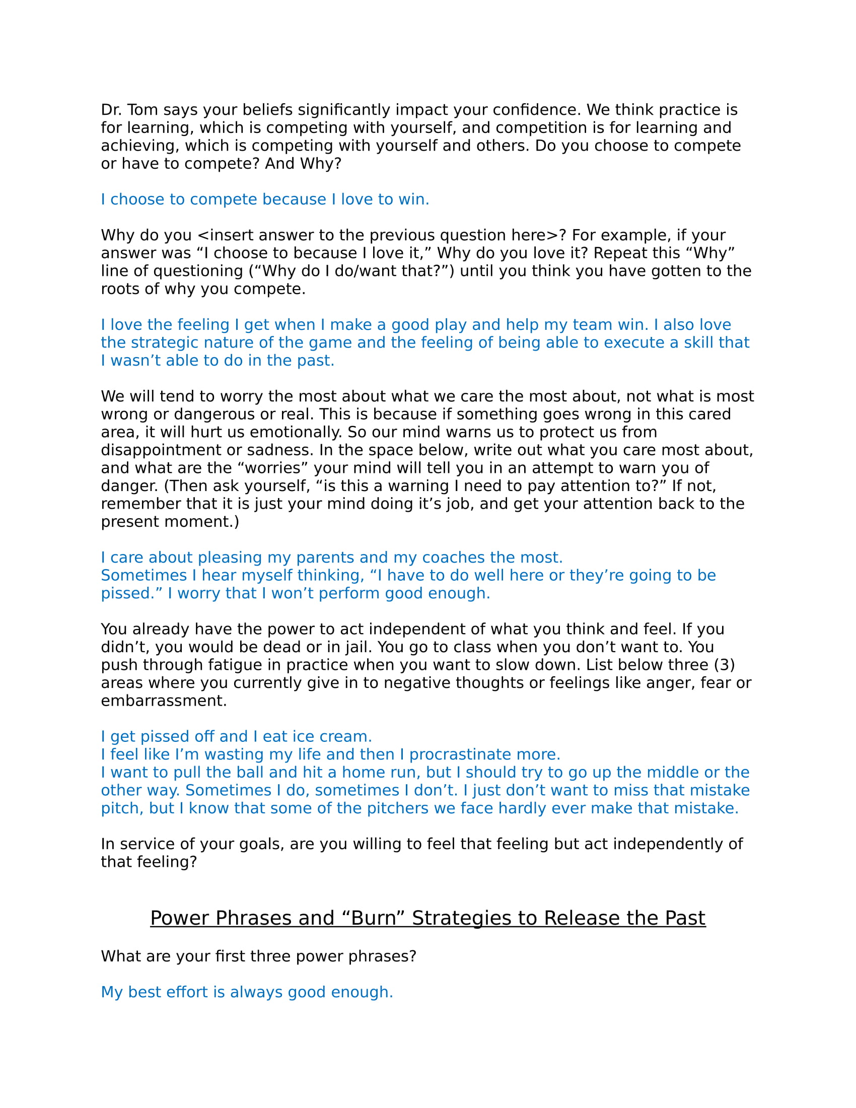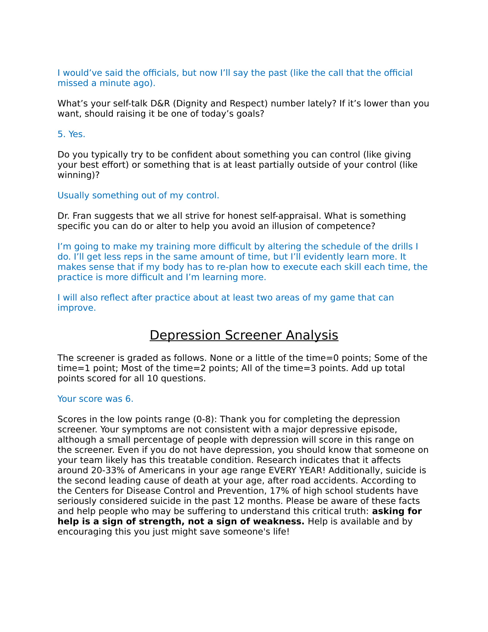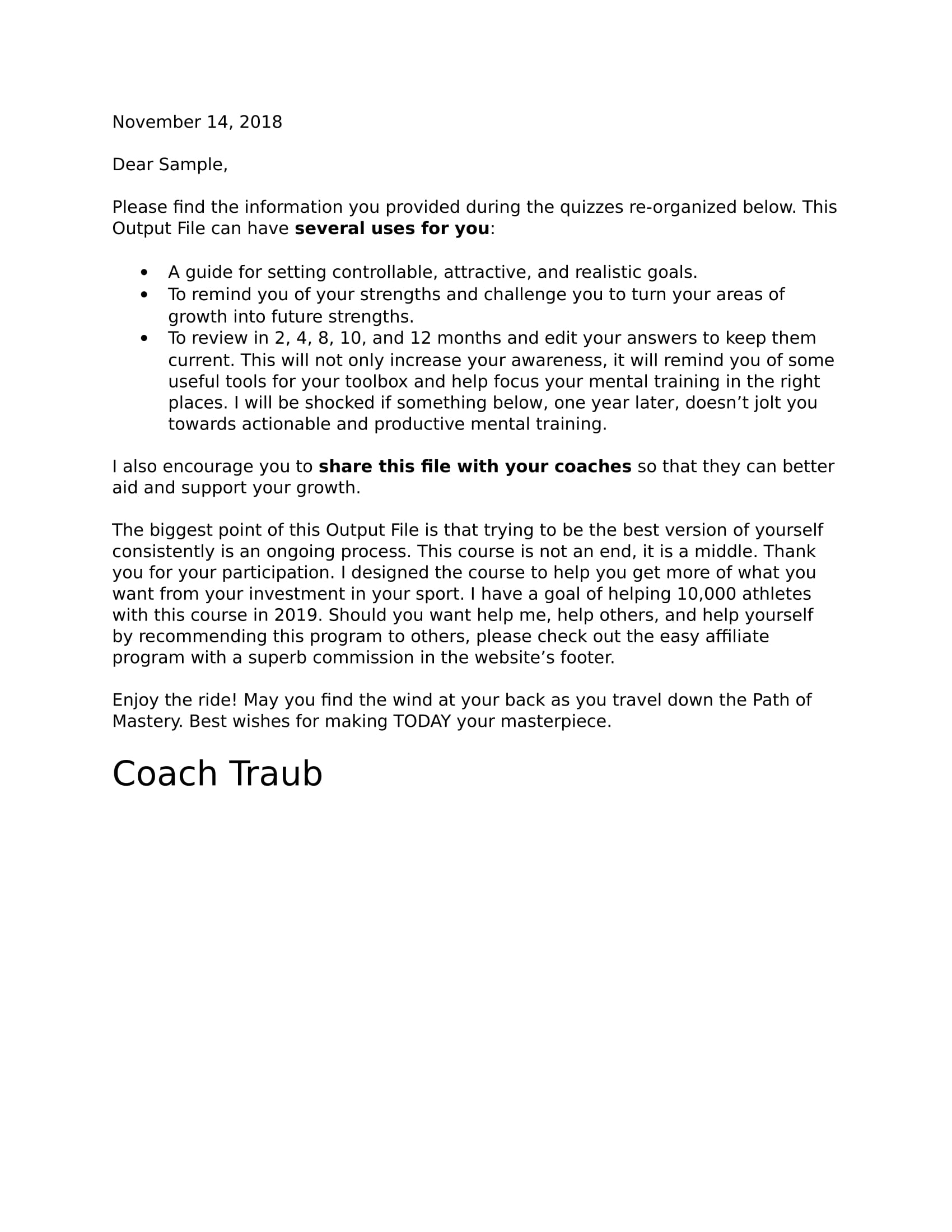 A sample of this output file is provided here. The answers are hypothetical…and represent a leader’s perspective. Some coaches may want to share this sample with their athletes before they start the course.
